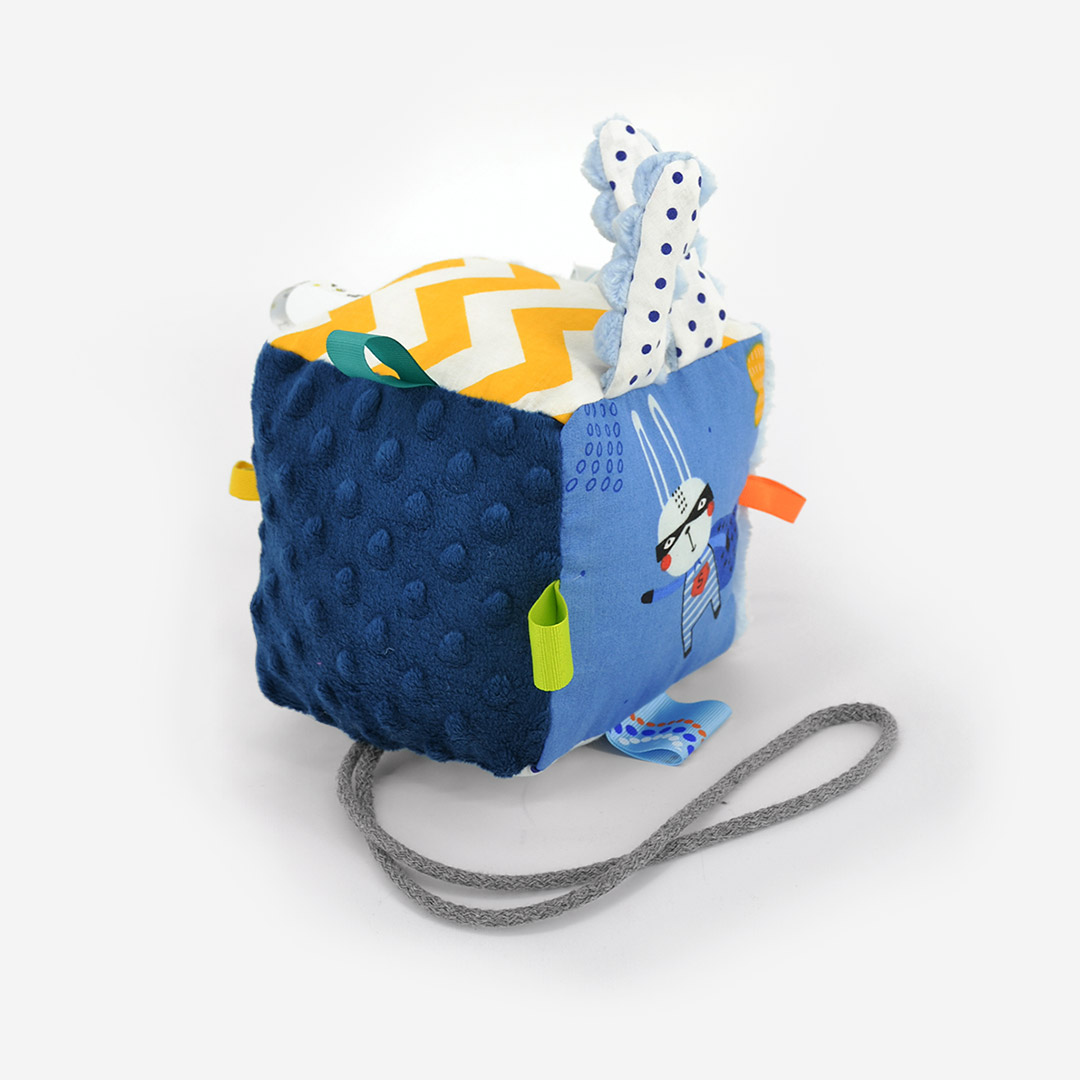 Kostki sensoryczne wyróżnia różnorodnośc barw i tekstur materiału. Zastosowanie różnorodnych elementów – w tym szeleszczących, sprawia, że zmysły maluszka: dotyk, słuch oraz wzrok są pobudzane do działania i rozwoju.